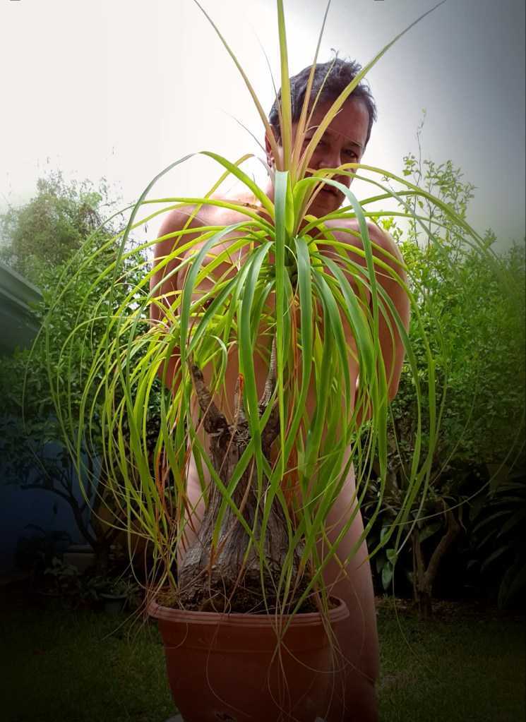 En una de mis fotos experimentales aparezco detrás de una palmera enana que tengo en mi patio. La imagen revela: 1. que estoy desnudo; pero, 2. que oculto mi desnudez integral. Si acaso se ven tres o cuatro centímetros de cadera o muslo.
