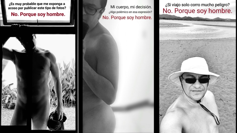 Pero a mí me han revelado cómo se siente exponer el cuerpo. Cosa que, por ser hombre, no estoy acostumbrado a sentir. Ni siquiera la presión por hacerlo. Ni el temor a que me juzguen. Revelan, pues, como señalé antes, más de la cultura en la que vivimos que de mí mismo. Por ejemplo, esto: que si fuese mujer, este tipo de fotos podrían conducir a insultos, a ser catalogada de puta, a que algunos hombres se creyeran con derechos sobre mi cuerpo, a que me enviaran mensajes o imágenes no solicitadas ni deseadas, a que alguien en mi lugar de trabajo me acosara y agrediera o me exigiera sexo, a que fulanito o menganito crean que si muestro parte de mi cuerpo o hablo libremente de sexo implica que quiero con cualquiera, o peor: que aunque no quiera pueden obligarme. Pero soy hombre, y porque soy hombre, es muy poco probable que las consecuencias lleguen a esos extremos de agresión. Este y muchos otros son privilegios porque solo nosotros los gozamos.