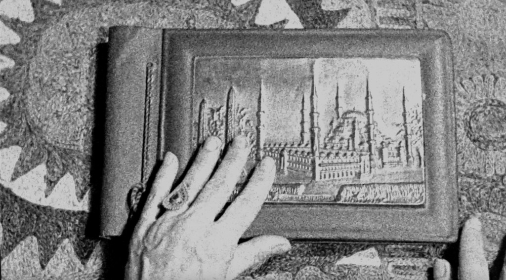 Fotografías fijas colocadas ordenadamente sobre un tapete oriental, puede ser, presentan un joven en la flor de la edad. Sobre las fotografías, en close-up, se posan suavemente unas manos sazonas, las yemas deslizándose cuidadosas en caricia sostenida. La imagen constituirá las tomas de transición y, justamente en su repetición, da cuerpo a uno de los leit-motifs más sobresaliente de la estructura del relato. Podríamos incluso sugerir que la serie de fotos, bien organizadas temáticamente, constituye el guion de la película. De hecho, la cineasta confirma: