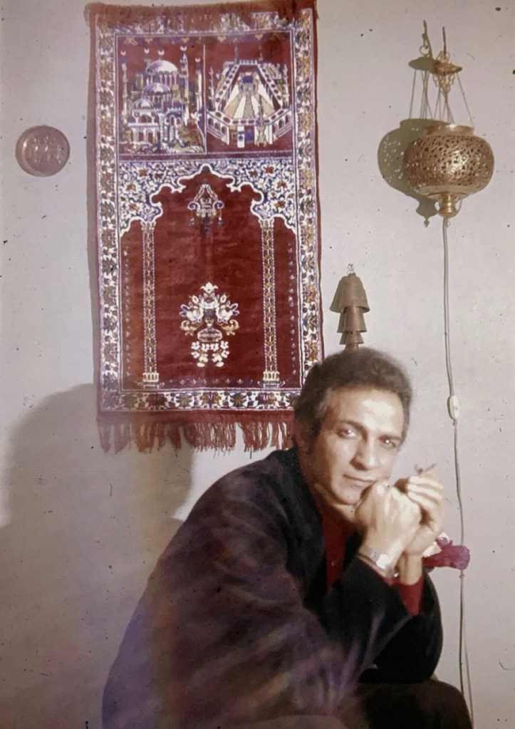 Lo que más me impresiona es constatar la mirada de ese hombre. No hay manera de que una mirada de ese tipo no cautive y convenza. Y lo más extraordinario es que la conserva durante toda su vida. Es una mirada que anda muy a tono con la voz, una voz suave, pausada, sin dramatismo de ninguna especie, de una calma angelical que captura y embruja. Ese es el tipo de persona que uno imagina como artista, el que comparte su arte, el que se proyecta en los demás y al que los demás adoran también, como se puede ver en las fotografías de sus grupos de artistas. Este amor al arte se puede ver en las citas poéticas de quien presumimos es parte de él, si no su hermano, su mejor amigo, recitando al poeta Falah Al-Jawahiri en un cuarto de inmigrante, imaginado también románticamente en un barrio de migrantes de Londres, con las dimensiones que puede tener tal morada y con los miles de objetos que no alcanzan y que él fue amontonando en paredes, mesas y estantes durante su vida en esa ciudad.